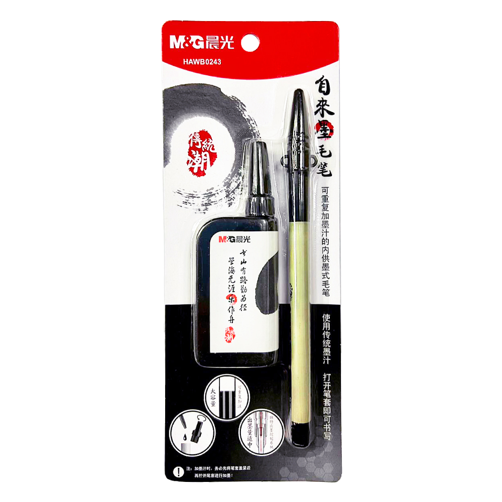 Our M&G writing brush with ink is an essential tool for Chinese calligraphy. The brush features an ink storage barrel that can hold a large volume of ink, making it easy to use and carry. The ink flows smoothly through the brush, creating crisp, precise strokes on paper. The brush can be easily refilled, ensuring that the artist always has enough ink for their work. Its portability and convenience make it a popular choice among calligraphers. Our brush's flexibility and absorbency also allow for a range of strokes and styles, making it a key tool in Chinese calligraphy.